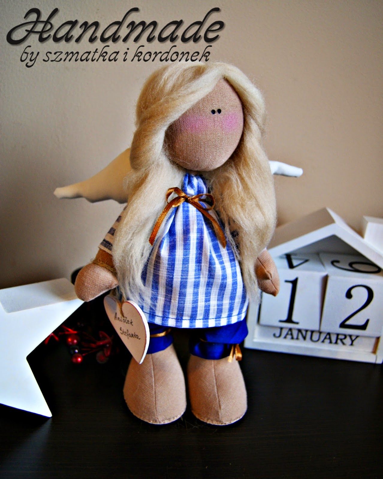 kolejny anioł w kolekcji, tym razem uszyty dla nowo narodzonego chłopczyka. Aniołek ma troszkę ponad 25 cm, ubrany jest w bawełniany komplecik w kolorach bieli i granatu i piękne blond włosy.