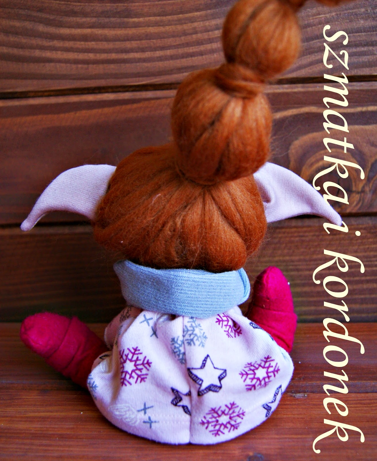 Oto powstała urocza malutka elfica Flora, w różowej sukience w gwiazdki i śnieżynki.