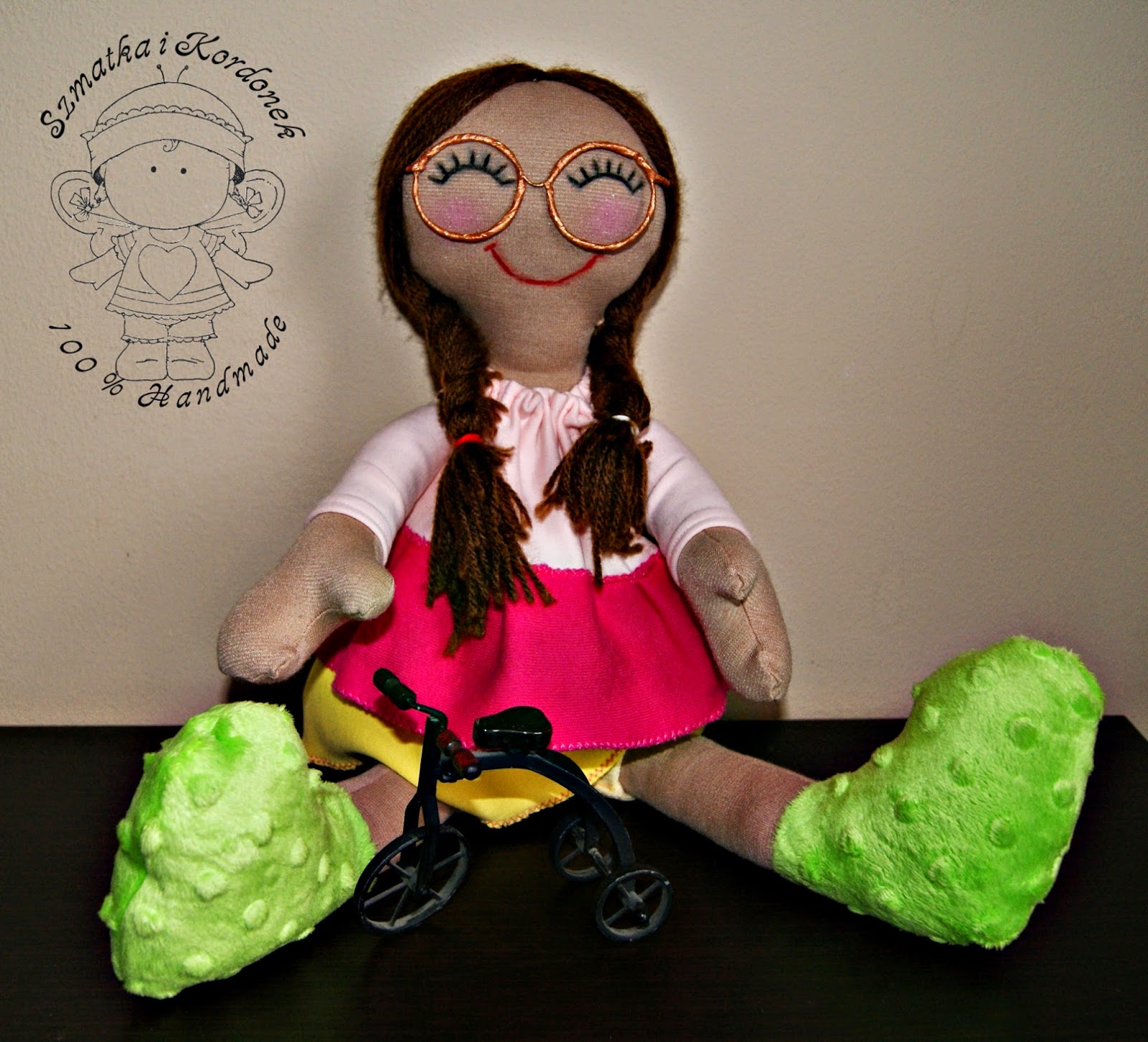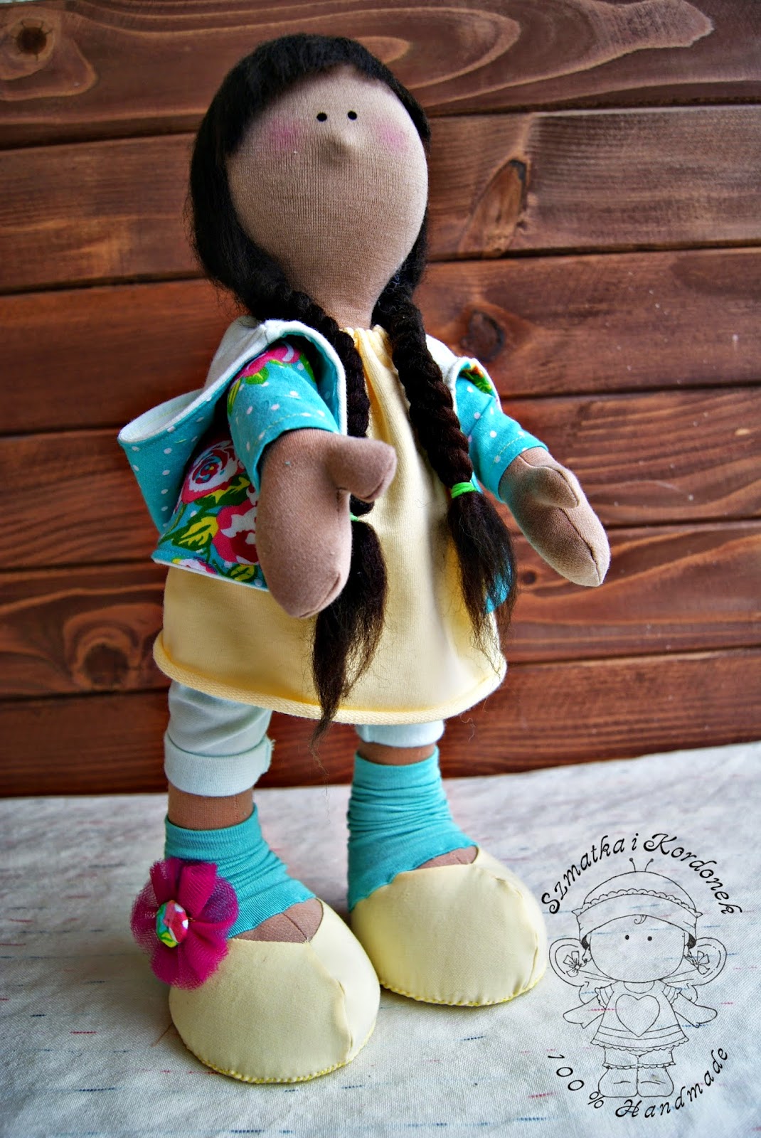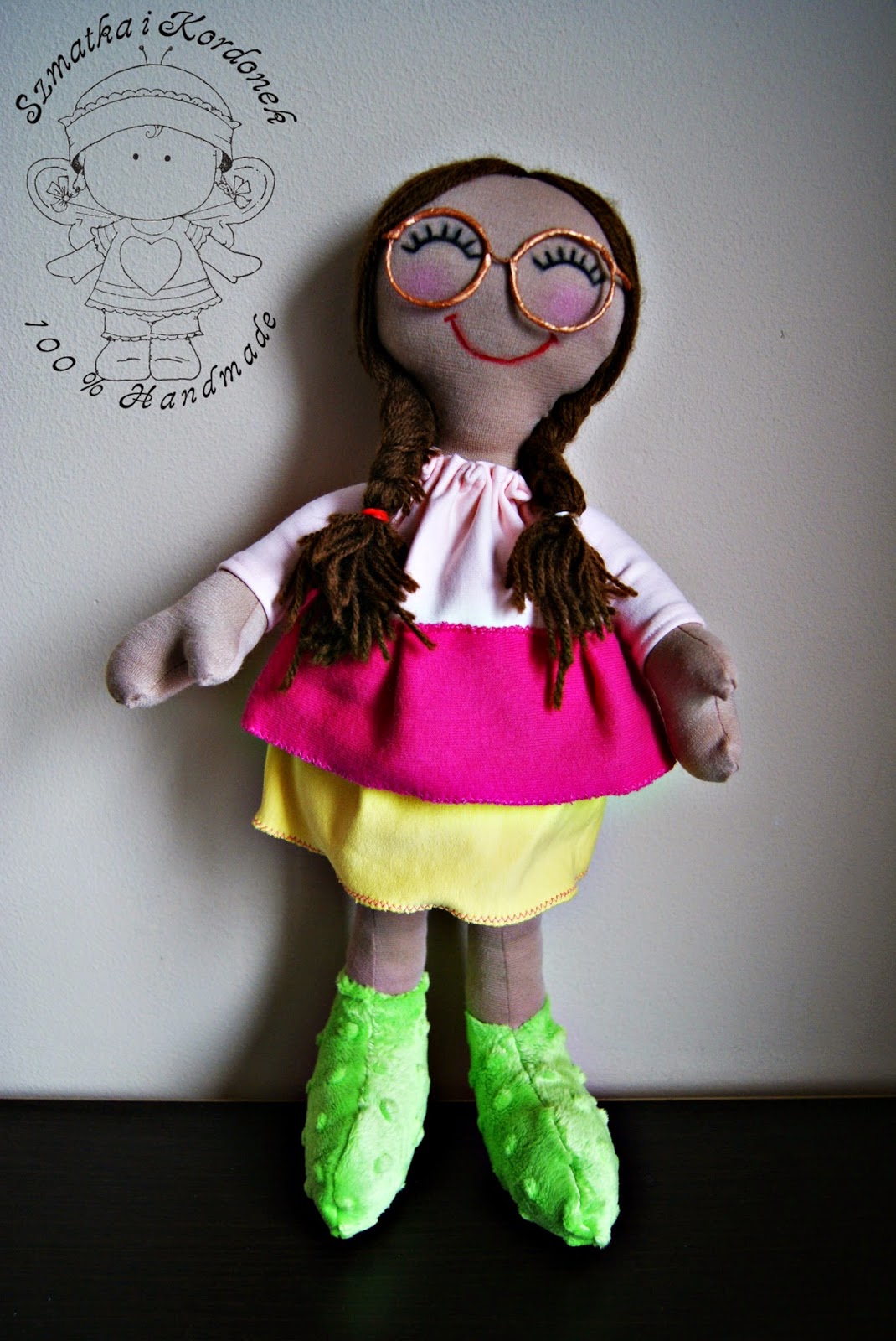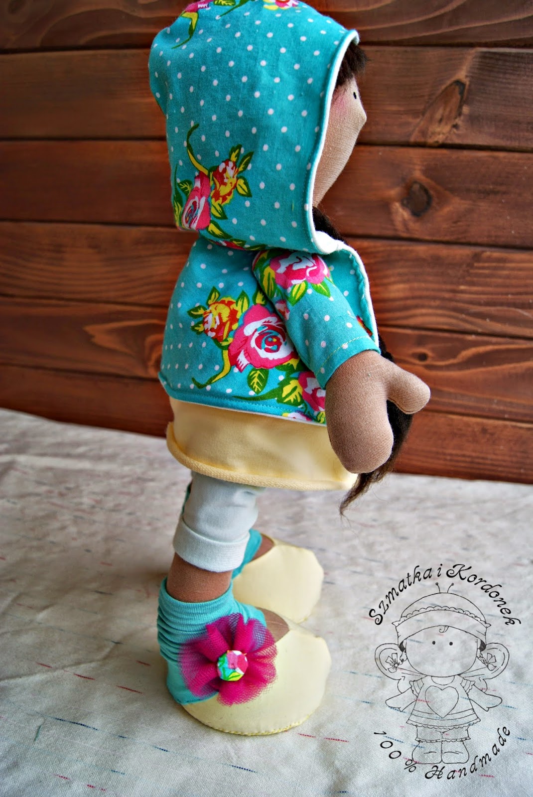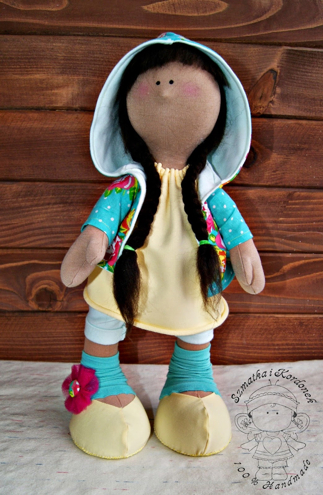 Nie jestem fanką lalek z uśmiechem bo wole takie "bez buźkowe" ale nie odmawiam szycia takich uśmiechniętych. Na specjalne zamówienie powstała lalka szmacianka dla dziewczynki która uwielbia intensywnie tulić lalki.... Lala miała być kolorowa, miękka i szeroko uśmiechnięta.